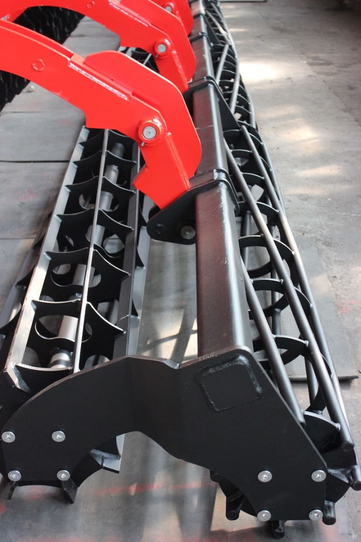 Большая рабочая скорость обработки (до 18 км/ч) позволяет достигать превосходного эффекта измельчения, перемешивания и улучшения крошения почвенного комка, благодаря полному перекрытию рабочей ширины рабочими органами и сдвоенным опорным шлейф-каткам разного диаметра. Вибрация пружинной стойки во время работы дополнительно улучшает крошение почвы. Глубина обработки до 12 см регулируется винтовым механизмом передних опорных колес и задними опорными катками. Сферические диски Bellota диаметром 560 мм установлены наклонно, на индивидуальных пружинных стойках Bellota в 2 ряда, что способствует лучшему обороту отрезаемого пласта, а также снижению требуемого тягового усилия трактора.